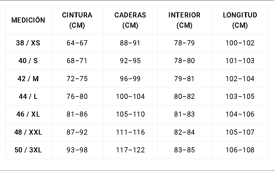 Incluye tu tabla de tallas en imagen (XS a 3XL con cintura, caderas, interior y longitud).