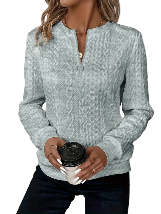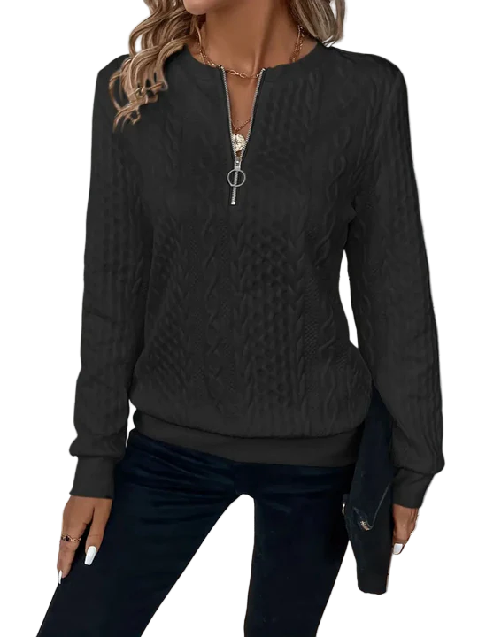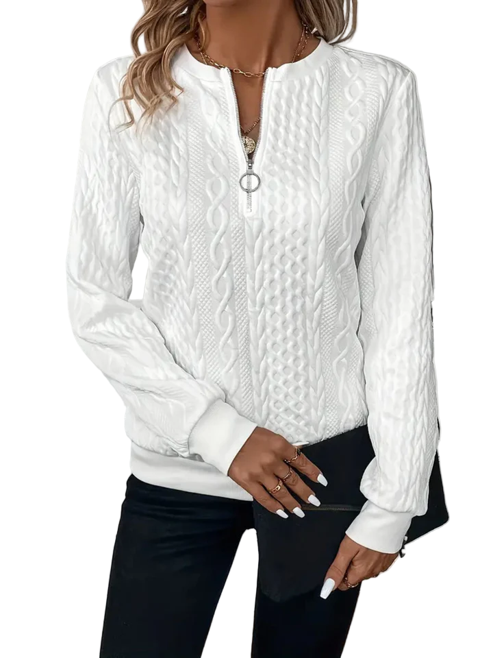 Este suéter combina el encanto clásico del punto trenzado con el toque moderno de una cremallera sutil y práctica. Una prenda diseñada para mujeres que buscan estilo, comodidad y versatilidad en un mismo gesto.
