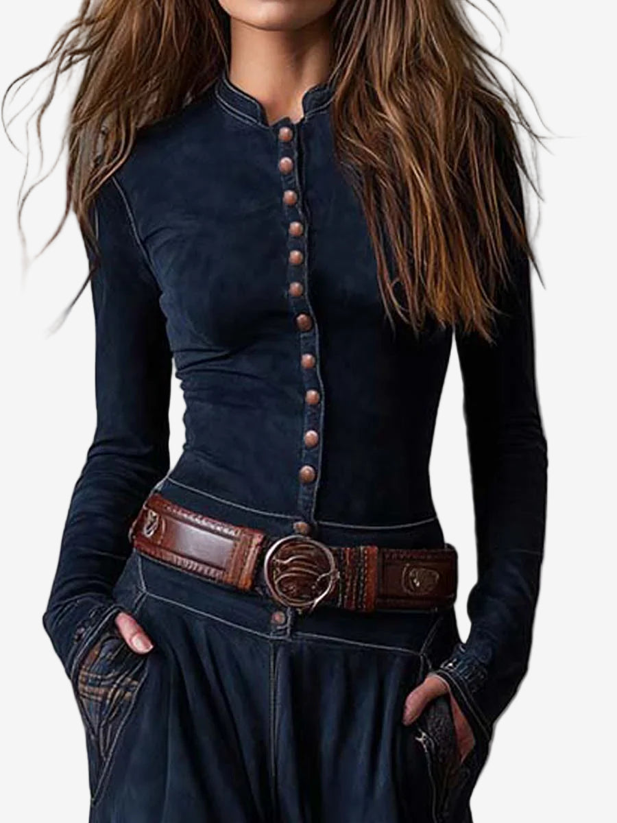 Cuerpo ajustado con cuello alto que aporta presencia y sofisticación