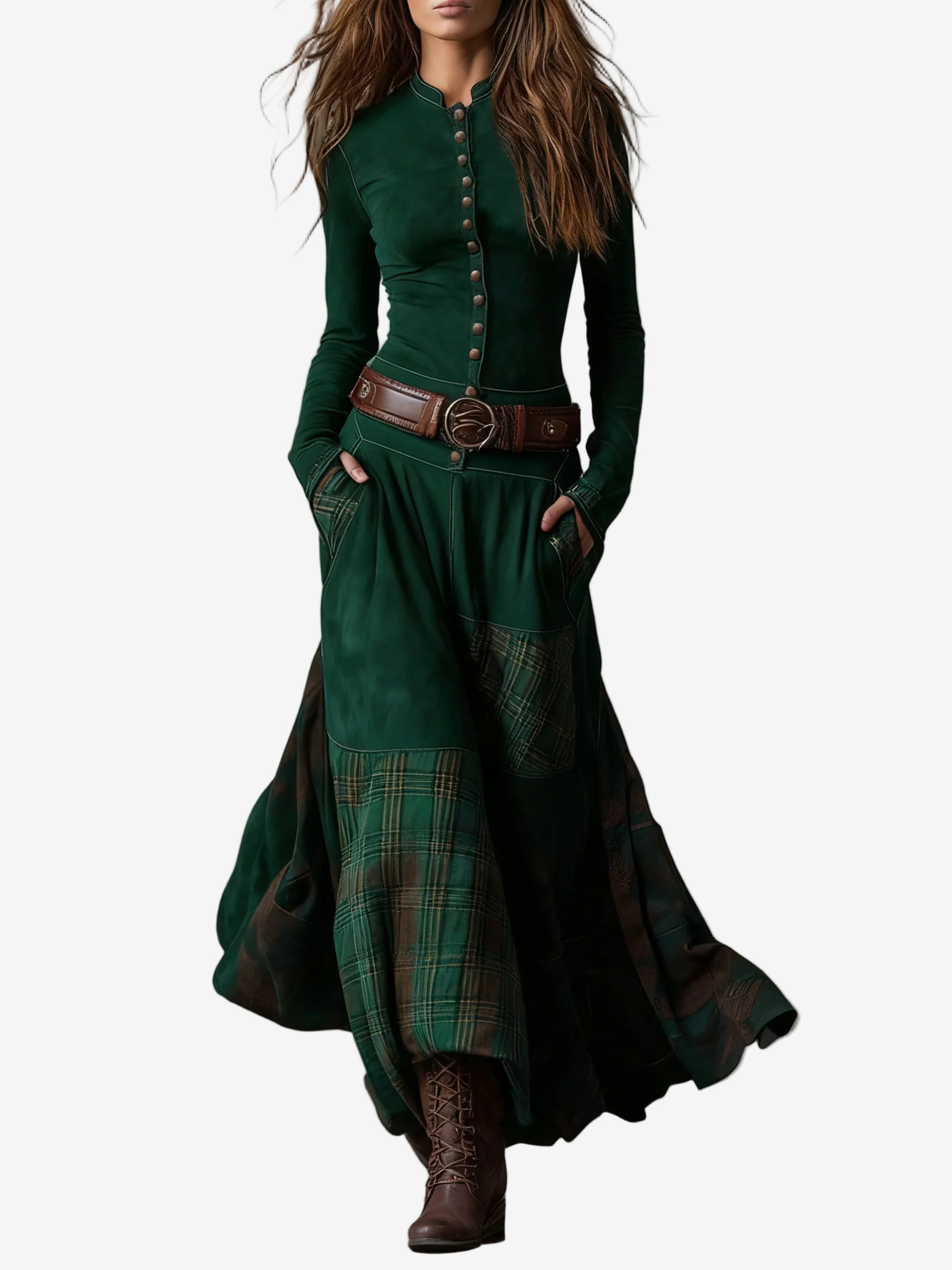 Este vestido largo combina una estética vintage con acabados modernos pensados para estilizar la figura y ofrecer comodidad durante todo el día. Su tejido efecto ante suave aporta una textura agradable y cálida, mientras que los paneles en cuadros generan un contraste elegante y dinámico que acompaña cada movimiento.